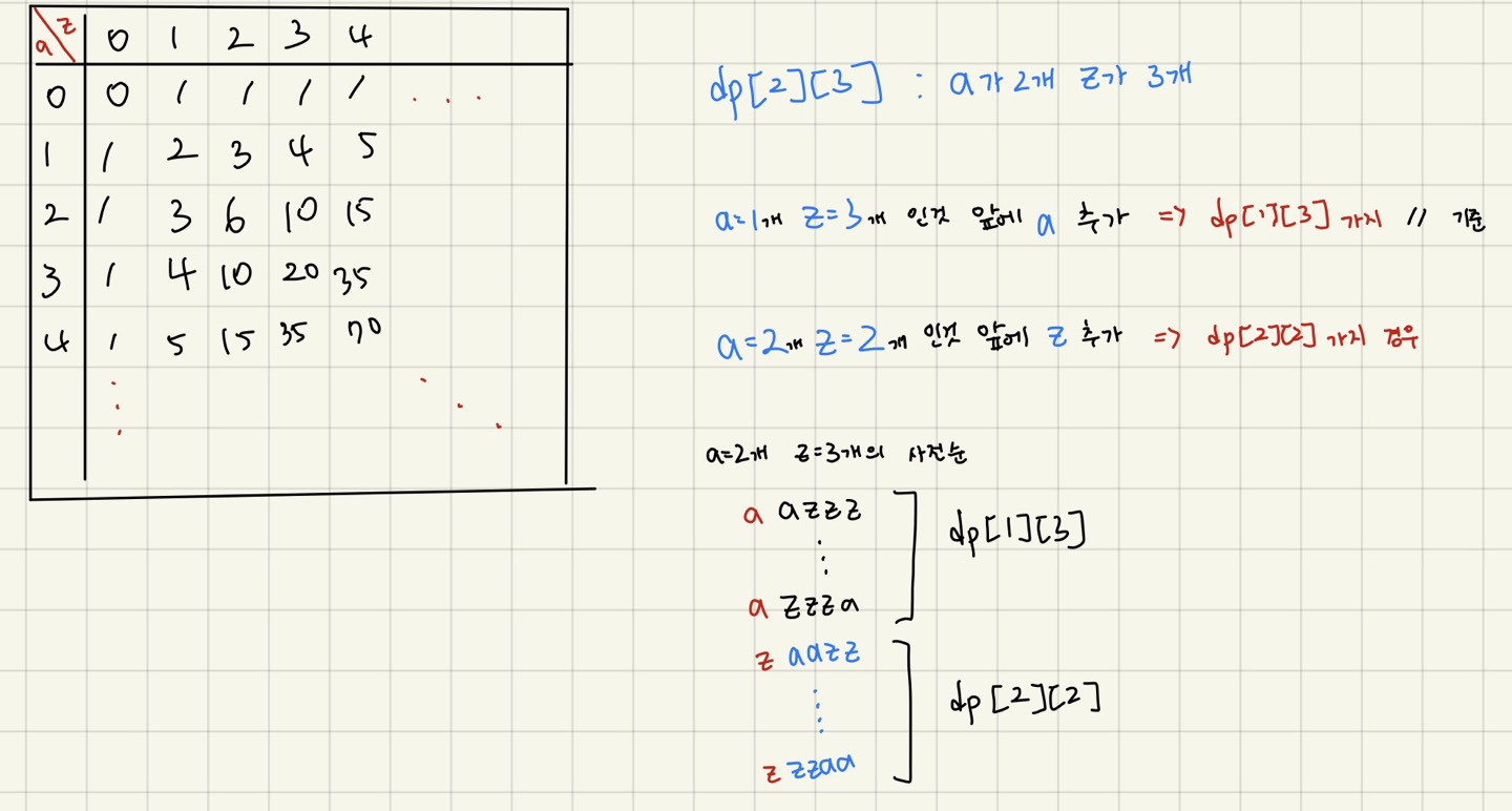 dp[i][j] = dp[i-1][j] + dp[i][j-1] 을 통하여 'a' i개와 'b' j개를 활용하여 만들 수 있는 단어의 개수를 구할 수 있다.